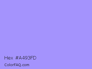 Hex #a493fd Color is a light indigo color and the nearest color is Dull Lavender #a899e6. Hex code #a493fd and RGB value is rgb(164,147,253). In RGB color space, this color is composed of 64% red, 58% green, 99% blue, In CMYK color space, this color is composed of 35% cyan, 42% magenta, 0% yellow , 1% black , In HSL color space, this color has a hue angle of 250° , 96% saturation and 78% lightness.