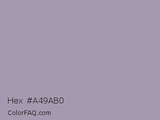 Hex #a49ab0 Color is a light violet color and the nearest color is Amethyst Smoke #a397b4. Hex code #a49ab0 and RGB value is rgb(164,154,176). In RGB color space, this color is composed of 64% red, 60% green, 69% blue, In CMYK color space, this color is composed of 7% cyan, 13% magenta, 0% yellow , 31% black , In HSL color space, this color has a hue angle of 267° , 12% saturation and 65% lightness.