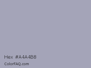 Hex #a4a4b8 Color is a light blue color and the nearest color is Gray Chateau #a2aab3. Hex code #a4a4b8 and RGB value is rgb(164,164,184). In RGB color space, this color is composed of 64% red, 64% green, 72% blue, In CMYK color space, this color is composed of 11% cyan, 11% magenta, 0% yellow , 28% black , In HSL color space, this color has a hue angle of 240° , 12% saturation and 68% lightness.