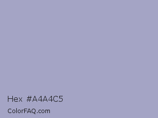 Hex #a4a4c5 Color is a light blue color and the nearest color is Logan #aaa9cd. Hex code #a4a4c5 and RGB value is rgb(164,164,197). In RGB color space, this color is composed of 64% red, 64% green, 77% blue, In CMYK color space, this color is composed of 17% cyan, 17% magenta, 0% yellow , 23% black , In HSL color space, this color has a hue angle of 240° , 22% saturation and 71% lightness.