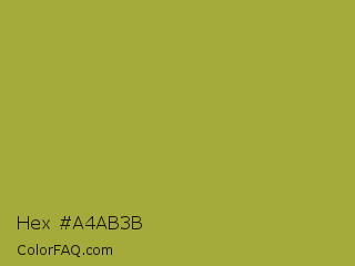 Hex #a4ab3b Color is a normal yellow color and the nearest color is Brass #b5a642. Hex code #a4ab3b and RGB value is rgb(164,171,59). In RGB color space, this color is composed of 64% red, 67% green, 23% blue, In CMYK color space, this color is composed of 4% cyan, 0% magenta, 65% yellow , 33% black , In HSL color space, this color has a hue angle of 64° , 49% saturation and 45% lightness.
