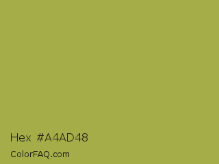 Hex #a4ad48 Color is a normal yellow color and the nearest color is Brass #b5a642. Hex code #a4ad48 and RGB value is rgb(164,173,72). In RGB color space, this color is composed of 64% red, 68% green, 28% blue, In CMYK color space, this color is composed of 5% cyan, 0% magenta, 58% yellow , 32% black , In HSL color space, this color has a hue angle of 65° , 41% saturation and 48% lightness.