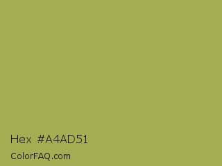 Hex #a4ad51 Color is a normal yellow color and the nearest color is Olive Green #b5b35c. Hex code #a4ad51 and RGB value is rgb(164,173,81). In RGB color space, this color is composed of 64% red, 68% green, 32% blue, In CMYK color space, this color is composed of 5% cyan, 0% magenta, 53% yellow , 32% black , In HSL color space, this color has a hue angle of 66° , 36% saturation and 50% lightness.