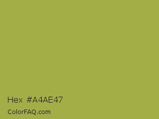Hex #a4ae47 Color is a normal yellow color and the nearest color is Brass #b5a642. Hex code #a4ae47 and RGB value is rgb(164,174,71). In RGB color space, this color is composed of 64% red, 68% green, 28% blue, In CMYK color space, this color is composed of 6% cyan, 0% magenta, 59% yellow , 32% black , In HSL color space, this color has a hue angle of 66° , 42% saturation and 48% lightness.