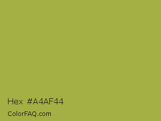 Hex #a4af44 Color is a normal yellow color and the nearest color is Brass #b5a642. Hex code #a4af44 and RGB value is rgb(164,175,68). In RGB color space, this color is composed of 64% red, 69% green, 27% blue, In CMYK color space, this color is composed of 6% cyan, 0% magenta, 61% yellow , 31% black , In HSL color space, this color has a hue angle of 66° , 44% saturation and 48% lightness.