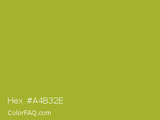 Hex #a4b32e Color is a normal yellow color and the nearest color is Citron #9fa91f. Hex code #a4b32e and RGB value is rgb(164,179,46). In RGB color space, this color is composed of 64% red, 70% green, 18% blue, In CMYK color space, this color is composed of 8% cyan, 0% magenta, 74% yellow , 30% black , In HSL color space, this color has a hue angle of 67° , 59% saturation and 44% lightness.
