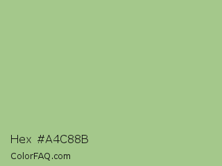 Hex #a4c88b Color is a light green color and the nearest color is Swamp Green #acb78e. Hex code #a4c88b and RGB value is rgb(164,200,139). In RGB color space, this color is composed of 64% red, 78% green, 55% blue, In CMYK color space, this color is composed of 18% cyan, 0% magenta, 31% yellow , 22% black , In HSL color space, this color has a hue angle of 95° , 36% saturation and 66% lightness.