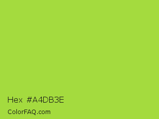 Hex #a4db3e Color is a normal green color and the nearest color is Conifer #acdd4d. Hex code #a4db3e and RGB value is rgb(164,219,62). In RGB color space, this color is composed of 64% red, 86% green, 24% blue, In CMYK color space, this color is composed of 25% cyan, 0% magenta, 72% yellow , 14% black , In HSL color space, this color has a hue angle of 81° , 69% saturation and 55% lightness.