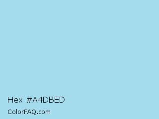 Hex #a4dbed Color is a light blue color and the nearest color is Non Photo Blue #a4dded. Hex code #a4dbed and RGB value is rgb(164,219,237). In RGB color space, this color is composed of 64% red, 86% green, 93% blue, In CMYK color space, this color is composed of 31% cyan, 8% magenta, 0% yellow , 7% black , In HSL color space, this color has a hue angle of 195° , 67% saturation and 79% lightness.