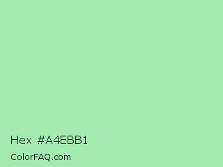 Hex #a4ebb1 Color is a light green color and the nearest color is Teal Deer #99e6b3. Hex code #a4ebb1 and RGB value is rgb(164,235,177). In RGB color space, this color is composed of 64% red, 92% green, 69% blue, In CMYK color space, this color is composed of 30% cyan, 0% magenta, 25% yellow , 8% black , In HSL color space, this color has a hue angle of 131° , 64% saturation and 78% lightness.