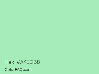 Hex #a4edb8 Color is a light green color and the nearest color is Chinook #a8e3bd. Hex code #a4edb8 and RGB value is rgb(164,237,184). In RGB color space, this color is composed of 64% red, 93% green, 72% blue, In CMYK color space, this color is composed of 31% cyan, 0% magenta, 22% yellow , 7% black , In HSL color space, this color has a hue angle of 136° , 67% saturation and 79% lightness.