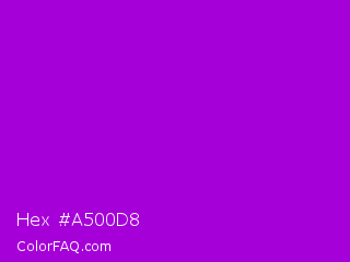 Hex #a500d8 Color is a normal purple color and the nearest color is Dark Violet #9400d3. Hex code #a500d8 and RGB value is rgb(165,0,216). In RGB color space, this color is composed of 65% red, 0% green, 85% blue, In CMYK color space, this color is composed of 24% cyan, 100% magenta, 0% yellow , 15% black , In HSL color space, this color has a hue angle of 286° , 100% saturation and 42% lightness.