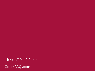 Hex #a5113b Color is a normal rose color and the nearest color is Vivid Burgundy #9f1d35. Hex code #a5113b and RGB value is rgb(165,17,59). In RGB color space, this color is composed of 65% red, 7% green, 23% blue, In CMYK color space, this color is composed of 0% cyan, 90% magenta, 64% yellow , 35% black , In HSL color space, this color has a hue angle of 343° , 81% saturation and 36% lightness.