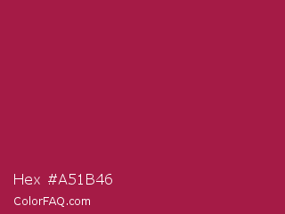 Hex #a51b46 Color is a normal rose color and the nearest color is French Wine #ac1e44. Hex code #a51b46 and RGB value is rgb(165,27,70). In RGB color space, this color is composed of 65% red, 11% green, 27% blue, In CMYK color space, this color is composed of 0% cyan, 84% magenta, 58% yellow , 35% black , In HSL color space, this color has a hue angle of 341° , 72% saturation and 38% lightness.