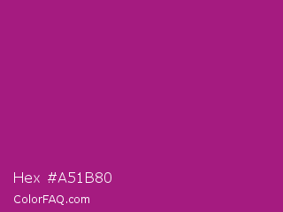 Hex #a51b80 Color is a normal magenta color and the nearest color is Royal Heath #ab3472. Hex code #a51b80 and RGB value is rgb(165,27,128). In RGB color space, this color is composed of 65% red, 11% green, 50% blue, In CMYK color space, this color is composed of 0% cyan, 84% magenta, 22% yellow , 35% black , In HSL color space, this color has a hue angle of 316° , 72% saturation and 38% lightness.