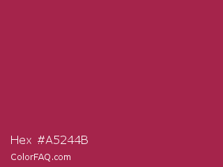 Hex #a5244b Color is a normal rose color and the nearest color is Amaranth Purple #ab274f. Hex code #a5244b and RGB value is rgb(165,36,75). In RGB color space, this color is composed of 65% red, 14% green, 29% blue, In CMYK color space, this color is composed of 0% cyan, 78% magenta, 55% yellow , 35% black , In HSL color space, this color has a hue angle of 342° , 64% saturation and 39% lightness.