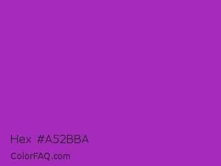 Hex #a52bba Color is a normal purple color and the nearest color is Dark Orchid #9932cc. Hex code #a52bba and RGB value is rgb(165,43,186). In RGB color space, this color is composed of 65% red, 17% green, 73% blue, In CMYK color space, this color is composed of 11% cyan, 77% magenta, 0% yellow , 27% black , In HSL color space, this color has a hue angle of 291° , 62% saturation and 45% lightness.