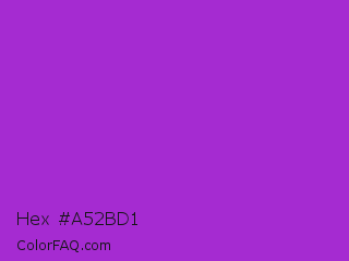 Hex #a52bd1 Color is a normal purple color and the nearest color is Dark Orchid #9932cc. Hex code #a52bd1 and RGB value is rgb(165,43,209). In RGB color space, this color is composed of 65% red, 17% green, 82% blue, In CMYK color space, this color is composed of 21% cyan, 79% magenta, 0% yellow , 18% black , In HSL color space, this color has a hue angle of 284° , 66% saturation and 49% lightness.