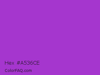 Hex #a536ce Color is a normal purple color and the nearest color is Dark Orchid #9932cc. Hex code #a536ce and RGB value is rgb(165,54,206). In RGB color space, this color is composed of 65% red, 21% green, 81% blue, In CMYK color space, this color is composed of 20% cyan, 74% magenta, 0% yellow , 19% black , In HSL color space, this color has a hue angle of 284° , 61% saturation and 51% lightness.