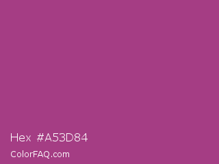 Hex #a53d84 Color is a normal magenta color and the nearest color is Maximum Red Purple #a63a79. Hex code #a53d84 and RGB value is rgb(165,61,132). In RGB color space, this color is composed of 65% red, 24% green, 52% blue, In CMYK color space, this color is composed of 0% cyan, 63% magenta, 20% yellow , 35% black , In HSL color space, this color has a hue angle of 319° , 46% saturation and 44% lightness.
