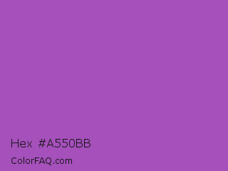 Hex #a550bb Color is a normal purple color and the nearest color is Purple Plum #9c51b6. Hex code #a550bb and RGB value is rgb(165,80,187). In RGB color space, this color is composed of 65% red, 31% green, 73% blue, In CMYK color space, this color is composed of 12% cyan, 57% magenta, 0% yellow , 27% black , In HSL color space, this color has a hue angle of 288° , 44% saturation and 52% lightness.