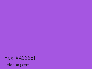 Hex #a556e1 Color is a light purple color and the nearest color is Navy Purple #9457eb. Hex code #a556e1 and RGB value is rgb(165,86,225). In RGB color space, this color is composed of 65% red, 34% green, 88% blue, In CMYK color space, this color is composed of 27% cyan, 62% magenta, 0% yellow , 12% black , In HSL color space, this color has a hue angle of 274° , 70% saturation and 61% lightness.