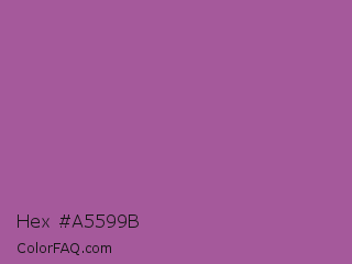 Hex #a5599b Color is a normal magenta color and the nearest color is Pearly Purple #b768a2. Hex code #a5599b and RGB value is rgb(165,89,155). In RGB color space, this color is composed of 65% red, 35% green, 61% blue, In CMYK color space, this color is composed of 0% cyan, 46% magenta, 6% yellow , 35% black , In HSL color space, this color has a hue angle of 308° , 30% saturation and 50% lightness.