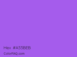 Hex #a55beb Color is a light purple color and the nearest color is Navy Purple #9457eb. Hex code #a55beb and RGB value is rgb(165,91,235). In RGB color space, this color is composed of 65% red, 36% green, 92% blue, In CMYK color space, this color is composed of 30% cyan, 61% magenta, 0% yellow , 8% black , In HSL color space, this color has a hue angle of 271° , 78% saturation and 64% lightness.