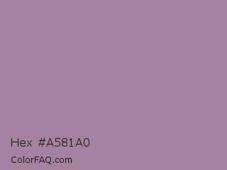 Hex #a581a0 Color is a normal magenta color and the nearest color is Bouquet #ae809e. Hex code #a581a0 and RGB value is rgb(165,129,160). In RGB color space, this color is composed of 65% red, 51% green, 63% blue, In CMYK color space, this color is composed of 0% cyan, 22% magenta, 3% yellow , 35% black , In HSL color space, this color has a hue angle of 308° , 17% saturation and 58% lightness.