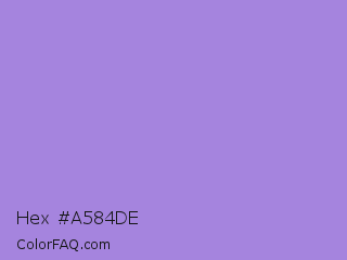 Hex #a584de Color is a light violet color and the nearest color is Lavender #b57edc. Hex code #a584de and RGB value is rgb(165,132,222). In RGB color space, this color is composed of 65% red, 52% green, 87% blue, In CMYK color space, this color is composed of 26% cyan, 41% magenta, 0% yellow , 13% black , In HSL color space, this color has a hue angle of 262° , 58% saturation and 69% lightness.