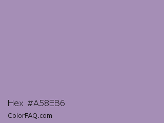 Hex #a58eb6 Color is a light purple color and the nearest color is Glossy Grape #ab92b3. Hex code #a58eb6 and RGB value is rgb(165,142,182). In RGB color space, this color is composed of 65% red, 56% green, 71% blue, In CMYK color space, this color is composed of 9% cyan, 22% magenta, 0% yellow , 29% black , In HSL color space, this color has a hue angle of 275° , 22% saturation and 64% lightness.