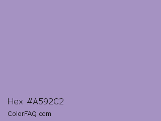 Hex #a592c2 Color is a light violet color and the nearest color is East Side #ac91ce. Hex code #a592c2 and RGB value is rgb(165,146,194). In RGB color space, this color is composed of 65% red, 57% green, 76% blue, In CMYK color space, this color is composed of 15% cyan, 25% magenta, 0% yellow , 24% black , In HSL color space, this color has a hue angle of 264° , 28% saturation and 67% lightness.