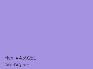 Hex #a592e1 Color is a light indigo color and the nearest color is Dull Lavender #a899e6. Hex code #a592e1 and RGB value is rgb(165,146,225). In RGB color space, this color is composed of 65% red, 57% green, 88% blue, In CMYK color space, this color is composed of 27% cyan, 35% magenta, 0% yellow , 12% black , In HSL color space, this color has a hue angle of 254° , 57% saturation and 73% lightness.