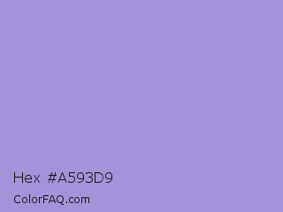 Hex #a593d9 Color is a light indigo color and the nearest color is East Side #ac91ce. Hex code #a593d9 and RGB value is rgb(165,147,217). In RGB color space, this color is composed of 65% red, 58% green, 85% blue, In CMYK color space, this color is composed of 24% cyan, 32% magenta, 0% yellow , 15% black , In HSL color space, this color has a hue angle of 255° , 48% saturation and 71% lightness.