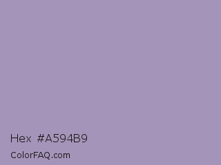 Hex #a594b9 Color is a light violet color and the nearest color is Amethyst Smoke #a397b4. Hex code #a594b9 and RGB value is rgb(165,148,185). In RGB color space, this color is composed of 65% red, 58% green, 73% blue, In CMYK color space, this color is composed of 11% cyan, 20% magenta, 0% yellow , 27% black , In HSL color space, this color has a hue angle of 268° , 21% saturation and 65% lightness.