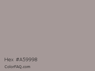 Hex #a59998 Color is a light red color and the nearest color is Dusty Gray #a8989b. Hex code #a59998 and RGB value is rgb(165,153,152). In RGB color space, this color is composed of 65% red, 60% green, 60% blue, In CMYK color space, this color is composed of 0% cyan, 7% magenta, 8% yellow , 35% black , In HSL color space, this color has a hue angle of 5° , 7% saturation and 62% lightness.
