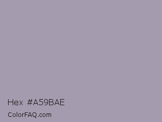 Hex #a59bae Color is a light purple color and the nearest color is Amethyst Smoke #a397b4. Hex code #a59bae and RGB value is rgb(165,155,174). In RGB color space, this color is composed of 65% red, 61% green, 68% blue, In CMYK color space, this color is composed of 5% cyan, 11% magenta, 0% yellow , 32% black , In HSL color space, this color has a hue angle of 272° , 10% saturation and 65% lightness.