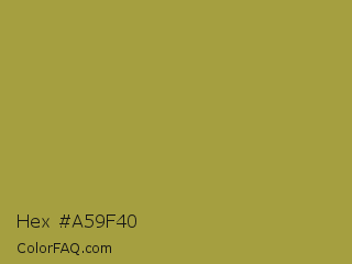 Hex #a59f40 Color is a normal yellow color and the nearest color is Brass #b5a642. Hex code #a59f40 and RGB value is rgb(165,159,64). In RGB color space, this color is composed of 65% red, 62% green, 25% blue, In CMYK color space, this color is composed of 0% cyan, 4% magenta, 61% yellow , 35% black , In HSL color space, this color has a hue angle of 56° , 44% saturation and 45% lightness.