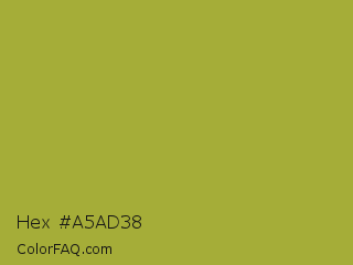 Hex #a5ad38 Color is a normal yellow color and the nearest color is Brass #b5a642. Hex code #a5ad38 and RGB value is rgb(165,173,56). In RGB color space, this color is composed of 65% red, 68% green, 22% blue, In CMYK color space, this color is composed of 5% cyan, 0% magenta, 68% yellow , 32% black , In HSL color space, this color has a hue angle of 64° , 51% saturation and 45% lightness.
