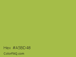 Hex #a5bd48 Color is a normal lime color and the nearest color is Android Green #a4c639. Hex code #a5bd48 and RGB value is rgb(165,189,72). In RGB color space, this color is composed of 65% red, 74% green, 28% blue, In CMYK color space, this color is composed of 13% cyan, 0% magenta, 62% yellow , 26% black , In HSL color space, this color has a hue angle of 72° , 47% saturation and 51% lightness.