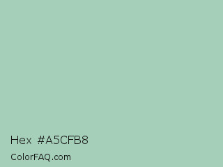 Hex #a5cfb8 Color is a light green color and the nearest color is Turquoise Green #a0d6b4. Hex code #a5cfb8 and RGB value is rgb(165,207,184). In RGB color space, this color is composed of 65% red, 81% green, 72% blue, In CMYK color space, this color is composed of 20% cyan, 0% magenta, 11% yellow , 19% black , In HSL color space, this color has a hue angle of 147° , 30% saturation and 73% lightness.