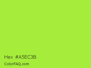 Hex #a5ec3b Color is a normal green color and the nearest color is Green Lizard #a7f432. Hex code #a5ec3b and RGB value is rgb(165,236,59). In RGB color space, this color is composed of 65% red, 93% green, 23% blue, In CMYK color space, this color is composed of 30% cyan, 0% magenta, 75% yellow , 7% black , In HSL color space, this color has a hue angle of 84° , 82% saturation and 58% lightness.