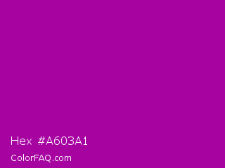 Hex #a603a1 Color is a normal magenta color and the nearest color is Violet Eggplant #991199. Hex code #a603a1 and RGB value is rgb(166,3,161). In RGB color space, this color is composed of 65% red, 1% green, 63% blue, In CMYK color space, this color is composed of 0% cyan, 98% magenta, 3% yellow , 35% black , In HSL color space, this color has a hue angle of 302° , 96% saturation and 33% lightness.