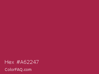 Hex #a62247 Color is a normal rose color and the nearest color is French Wine #ac1e44. Hex code #a62247 and RGB value is rgb(166,34,71). In RGB color space, this color is composed of 65% red, 13% green, 28% blue, In CMYK color space, this color is composed of 0% cyan, 80% magenta, 57% yellow , 35% black , In HSL color space, this color has a hue angle of 343° , 66% saturation and 39% lightness.