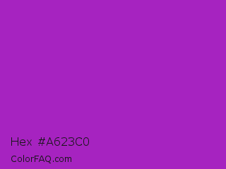 Hex #a623c0 Color is a normal purple color and the nearest color is Dark Orchid #9932cc. Hex code #a623c0 and RGB value is rgb(166,35,192). In RGB color space, this color is composed of 65% red, 14% green, 75% blue, In CMYK color space, this color is composed of 14% cyan, 82% magenta, 0% yellow , 25% black , In HSL color space, this color has a hue angle of 290° , 69% saturation and 45% lightness.