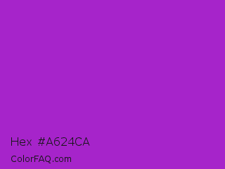 Hex #a624ca Color is a normal purple color and the nearest color is Dark Orchid #9932cc. Hex code #a624ca and RGB value is rgb(166,36,202). In RGB color space, this color is composed of 65% red, 14% green, 79% blue, In CMYK color space, this color is composed of 18% cyan, 82% magenta, 0% yellow , 21% black , In HSL color space, this color has a hue angle of 287° , 70% saturation and 47% lightness.