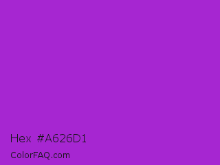Hex #a626d1 Color is a normal purple color and the nearest color is Dark Orchid #9932cc. Hex code #a626d1 and RGB value is rgb(166,38,209). In RGB color space, this color is composed of 65% red, 15% green, 82% blue, In CMYK color space, this color is composed of 21% cyan, 82% magenta, 0% yellow , 18% black , In HSL color space, this color has a hue angle of 285° , 69% saturation and 48% lightness.
