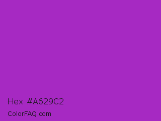 Hex #a629c2 Color is a normal purple color and the nearest color is Dark Orchid #9932cc. Hex code #a629c2 and RGB value is rgb(166,41,194). In RGB color space, this color is composed of 65% red, 16% green, 76% blue, In CMYK color space, this color is composed of 14% cyan, 79% magenta, 0% yellow , 24% black , In HSL color space, this color has a hue angle of 289° , 65% saturation and 46% lightness.