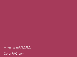 Hex #a63a5a Color is a normal rose color and the nearest color is Night Shadz #aa375a. Hex code #a63a5a and RGB value is rgb(166,58,90). In RGB color space, this color is composed of 65% red, 23% green, 35% blue, In CMYK color space, this color is composed of 0% cyan, 65% magenta, 46% yellow , 35% black , In HSL color space, this color has a hue angle of 342° , 48% saturation and 44% lightness.
