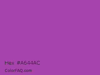 Hex #a644ac Color is a normal magenta color and the nearest color is Purpureus #9a4eae. Hex code #a644ac and RGB value is rgb(166,68,172). In RGB color space, this color is composed of 65% red, 27% green, 67% blue, In CMYK color space, this color is composed of 3% cyan, 60% magenta, 0% yellow , 33% black , In HSL color space, this color has a hue angle of 297° , 43% saturation and 47% lightness.
